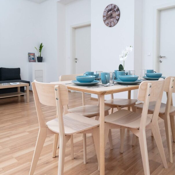 Dieses geräumige Apartment verfügt über eine gut ausgestattete Küche, eine Wohnküche mit Essbereich und Schlafcouch, 2 Schlafzimmer mit je zwei Einzelbetten oder je ein Doppelbett sowie ein Badezimmer mit WC und Dusche.