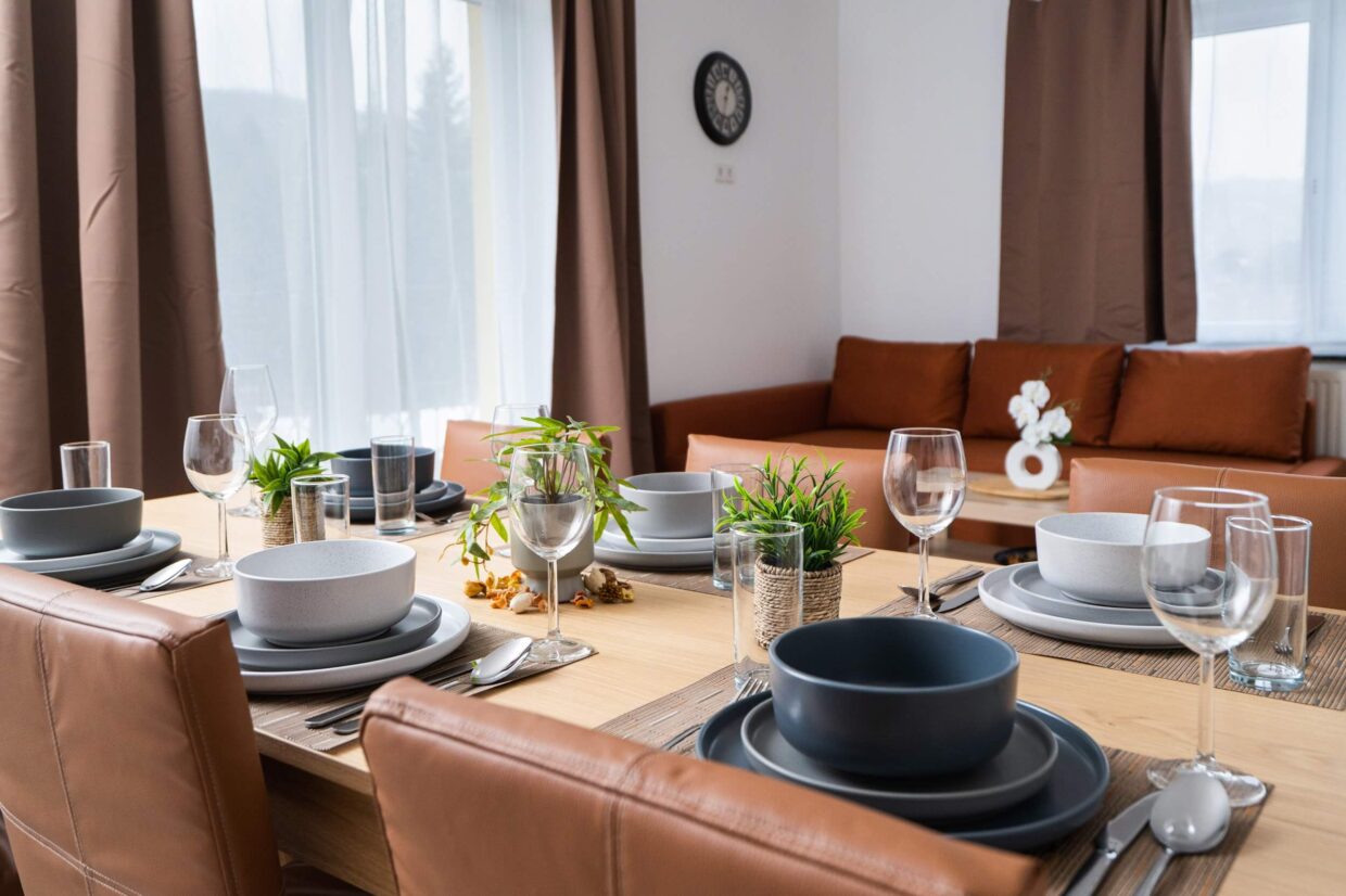 Die voll ausgestattete Küche verfügt über Herd, Kühlschrank, Geschirrspüler und sämtliche Küchenutensilien und eignet sich perfekt für gemeinsame Mahlzeiten. Für Unterhaltung sorgen zwei Smart-TVs mit Streaming-Diensten.
