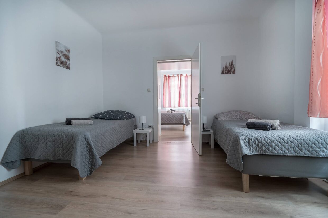 Der Wohnbereich ist mit einem Flachbildfernseher mit Streaming-Diensten ausgestattet, ideal für Unterhaltung, sowie einer Tee- und Kaffeemaschine, um den Tag perfekt zu beginnen. Große Fenster bieten einen herrlichen Blick auf die Stadt und verleihen dem Apartment zusätzlichen Charme. Mit sieben komfortablen Betten bietet das Apartment Platz für bis zu sieben Gäste – ein großzügiger Rückzugsort für alle.